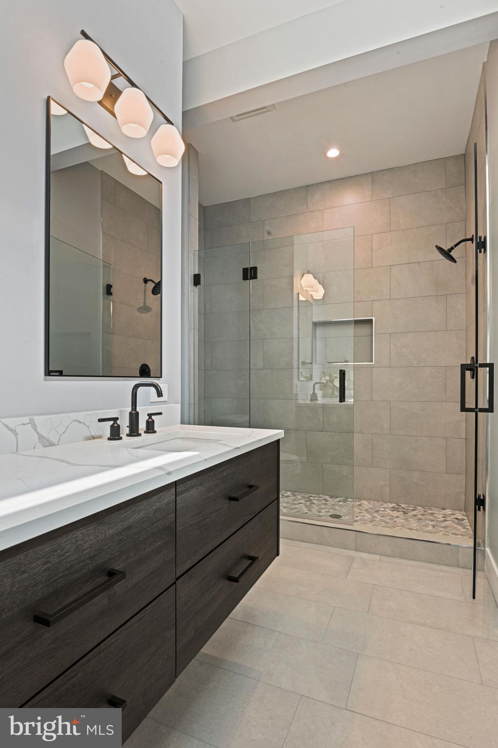 Inside, you're greeted by soaring 10-foot ceilings, wide-plank hardwood floors, and a striking floating staircase. The main level features an open, light-filled living room that flows effortlessly into the dining area, ideal for both everyday living and entertaining. The chef's kitchen is a true centerpiece, complete with custom cabinetry, soft-close drawers, a waterfall quartz island, Sub-Zero and Wolf appliances, and a separate prep kitchen with an oversized pantry. A secondary main-level suite offers a full bath, walk-in closet, and bedroom, perfect for guests or multigenerational living. A gas fireplace anchors the family room, which opens to a rear deck, perfect for indoor-outdoor gatherings.