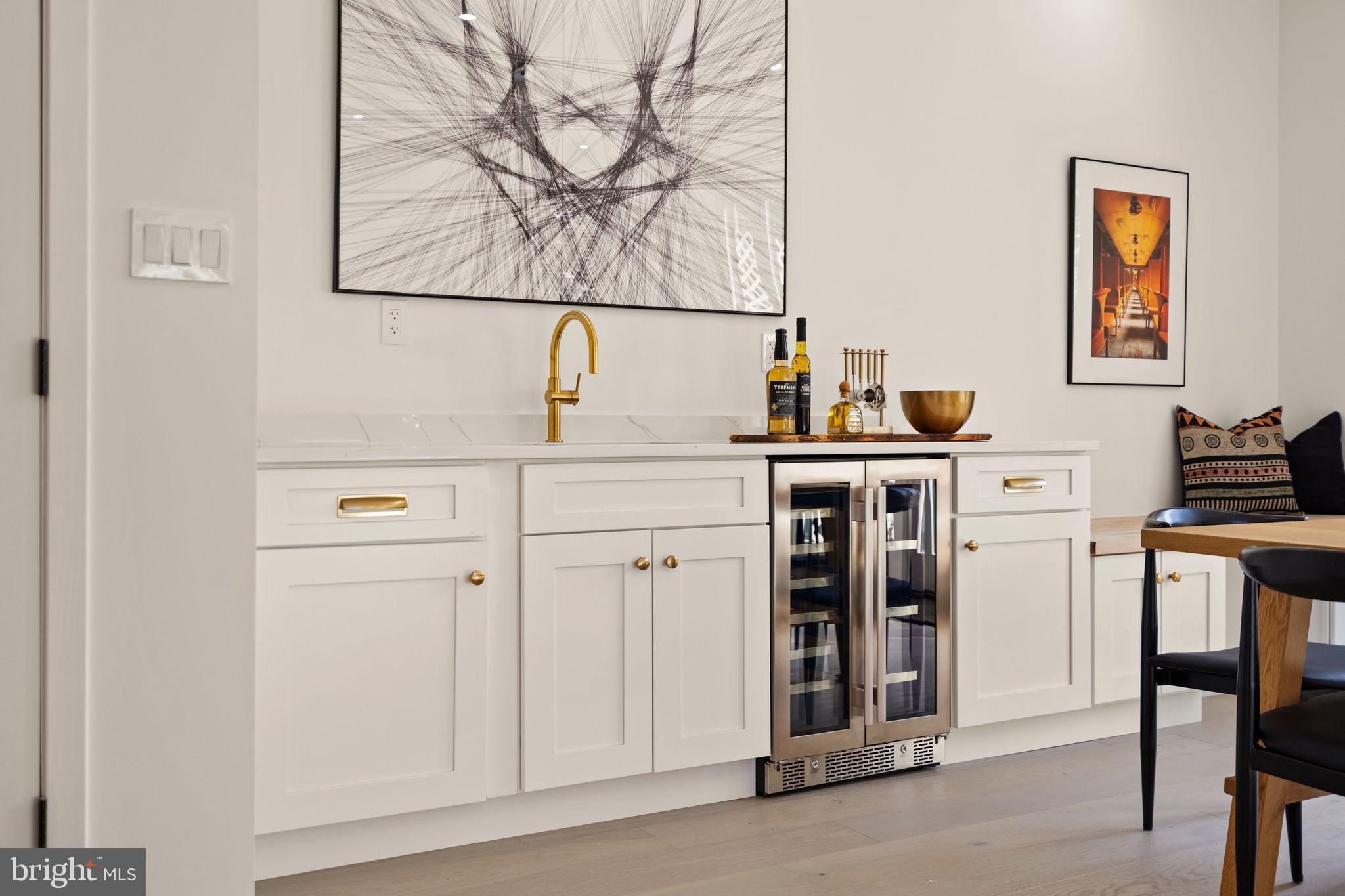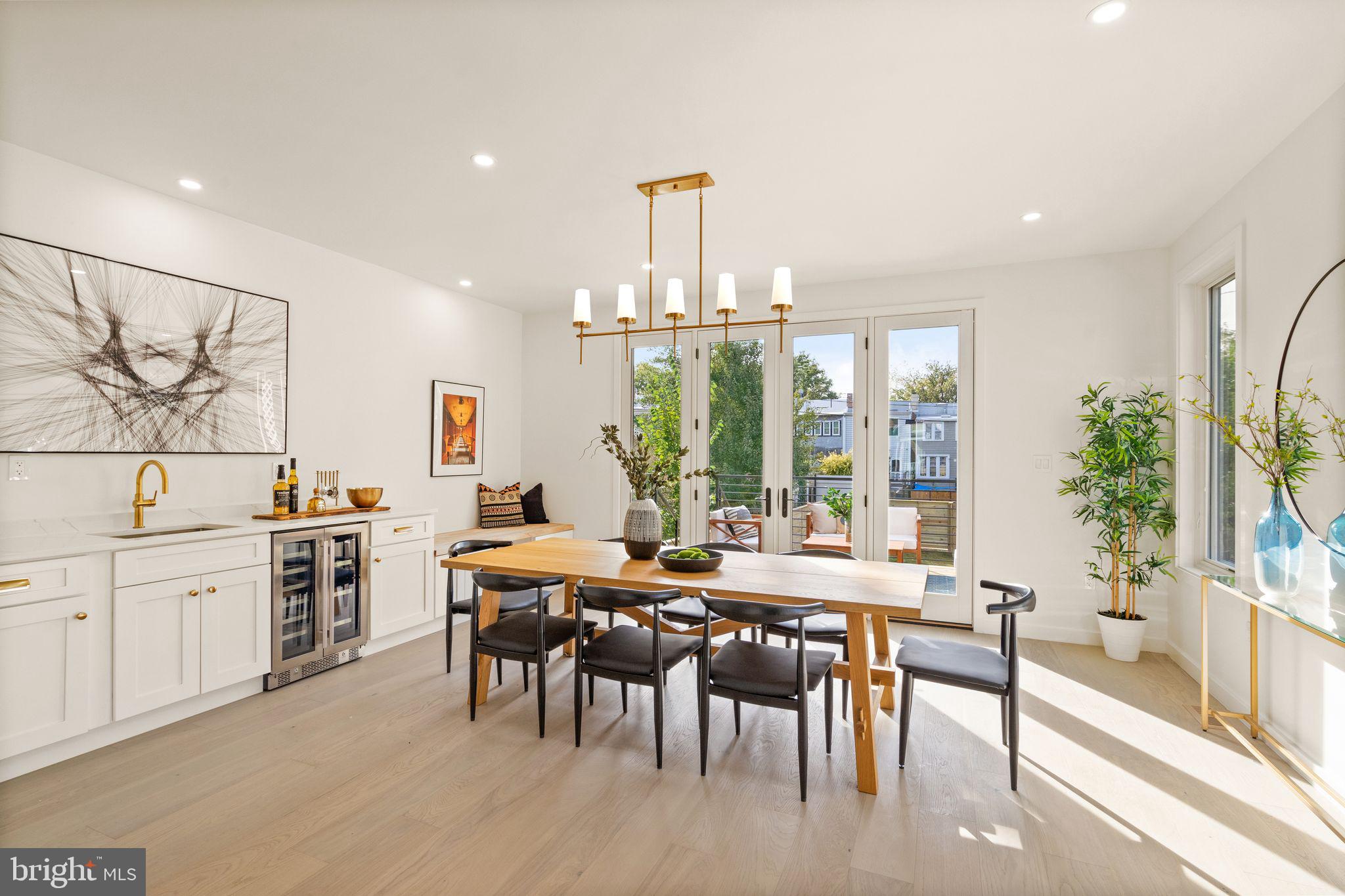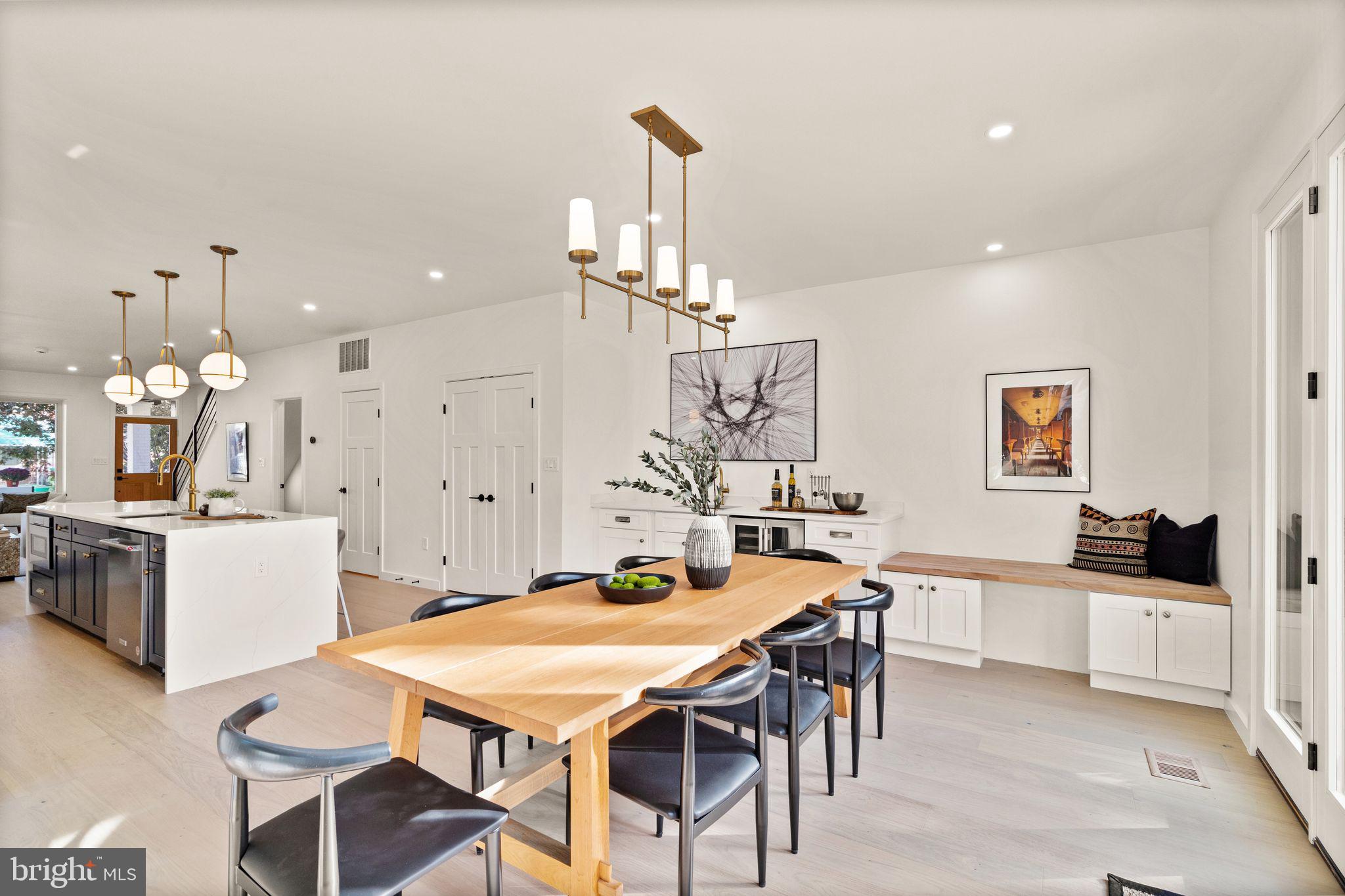 The main level has generously sized rooms and an open floor plan perfect for modern living and entertaining. The exquisite chefs' kitchen features high end KitchenAid appliances with a 6 burner range and custom cabinetry including a pantry with pull-out shelves. The kitchen island offers thoughtful storage and abundant counter space, perfect for cozy family meals or sophisticated entertaining. The dining room flows from the kitchen, opens to the large outdoor deck, and features a dramatic full wall of Pella glass doors for maximum sunlight. A wet bar with additional storage and a built in bench are a wonderful amenity. A half bath and huge coat closet round out this level.